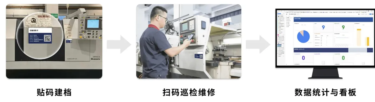 - 点检、维保、报修扫码记录,故障自动派单,形成电子履历,责任到人